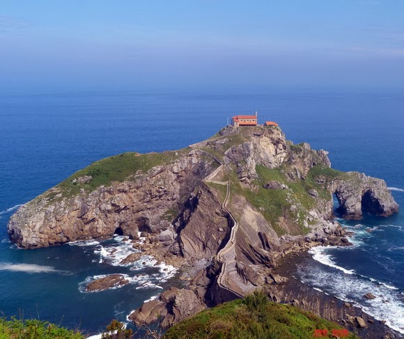 This beautiful path is located on the island Gaztelugatxe in Spain. Gaztelugatxe is a tiny islet on the coast of Biscay belonging to the municipality of Bermeo, in Basque Country (Spain).