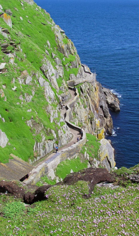 Photography shows breathtaking cliff scenery, with a view of the Blasket Islands. This is a famous shot of a flock of sheep making their way up the path. [link, map]